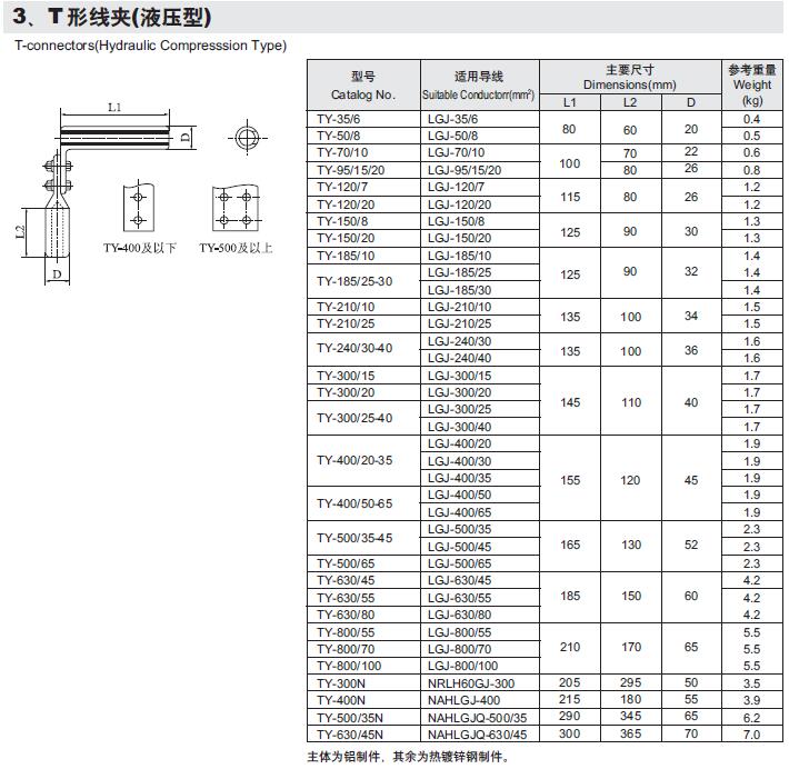 T型線夾主要用于架空電力線路或變電站,在母線的干線上以“T”形方式引下分支。分螺栓型,壓縮型兩種,共9個系列、71個型號。此外小截面導(dǎo)線也可用并溝線夾作為T型連接。