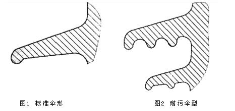 普通型絕緣子采用標準傘形(見圖1)。耐污型、耐重污型絕緣子采用經人工污穢試驗優(yōu)選的大小傘相間 、傘下帶棱的傘形( 見圖2 )。由于小傘處于大傘的保護之下不易受污染,且大傘間間距較大 ,改善了傘間放電特性,因而提高了絕緣子的耐污性能,并有利于帶電水沖洗。