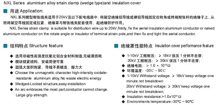 NXL(NEK)系列楔形耐張線夾,主要型號(hào)有:NEK-1,NEK-2,NEK-3,NEK-4,NEK(Z)-2,NEK(Z)-3,NEK-3B,NEK楔形鋁合金耐張線夾.絕緣罩。NXL-1,NXL-2,NXL-3,NXL-4.NXL-2J.NXL-3J,NXL-4J.