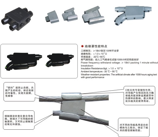 JXL系列C形線(xiàn)夾適用于配電系統(tǒng)中導(dǎo)線(xiàn)的非承力連接或T接, 是并溝線(xiàn)夾、T形線(xiàn)夾的理想替代產(chǎn)品,采用專(zhuān)用工具彈射安裝, 方便可靠。JXLD接地線(xiàn)夾用于線(xiàn)路中驗(yàn)電和臨時(shí)接地或多路分接, 能有效地避免因?qū)Ь€(xiàn)因臨時(shí)接地而受電弧燒傷和多次連接形成導(dǎo)線(xiàn) 磨損。絕緣罩由硅橡膠壓制而成,與線(xiàn)夾配套使用,起絕緣防護(hù) 作用。