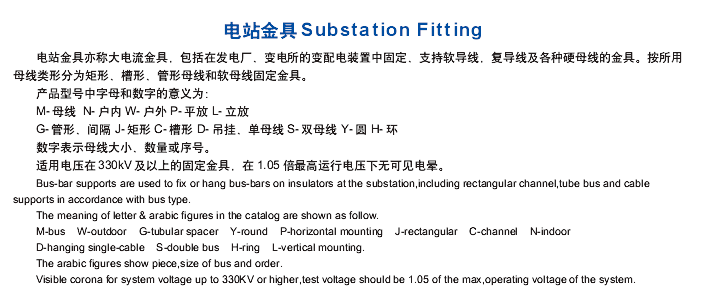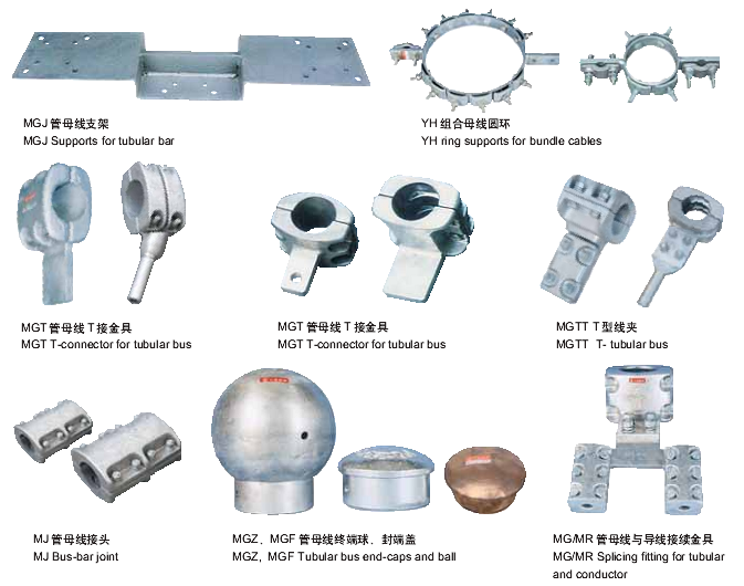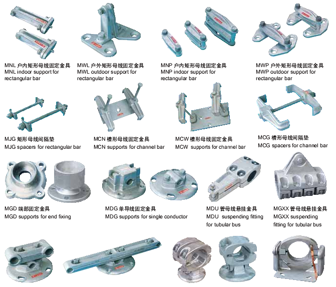 戶內(nèi)母線固定金具M(jìn)NP平放式,MWP平放式,MNL立放式,MWL立放式,矩形母線間隔墊MJG,槽形母線固定金具(MCN,MCW),槽形母線間隔墊MCG,管形母線固定金具,軟母線金具,跨路金具,鋁合金導(dǎo)電管母線
